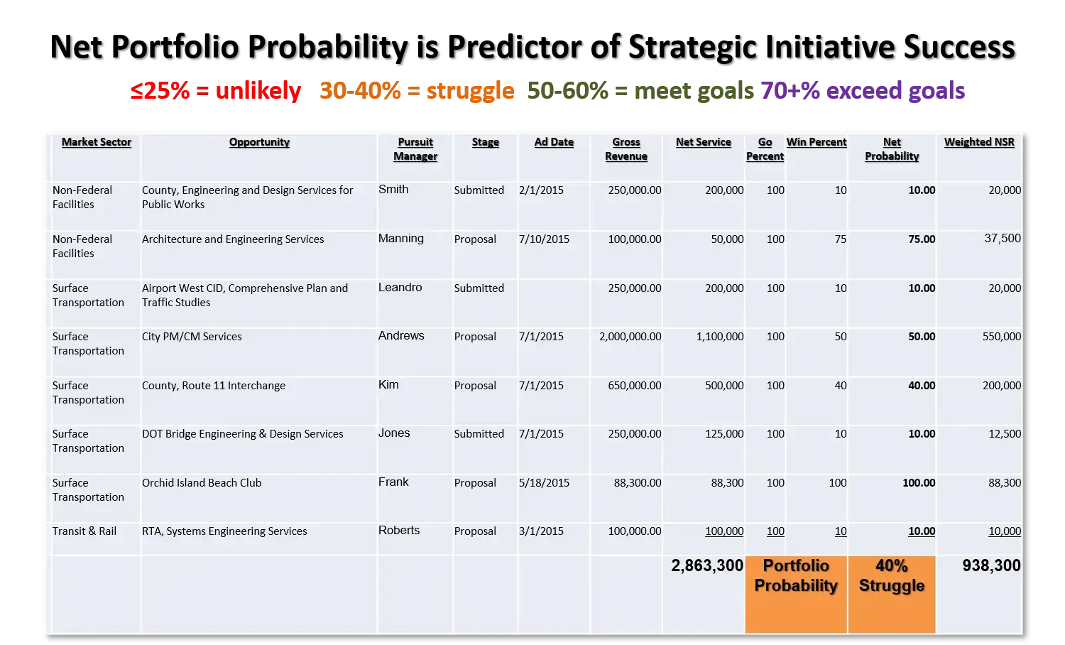 Rather than just compiling a “wish list” of potential projects, a Strategic Pursuit Program helps you build a robust pipeline of winnable opportunities. Our approach includes comprehensive leadership training and coaching to ensure pursuit programs are effectively developed and managed—whether for firm-wide growth or to enter new markets, geographic areas, services, or delivery methods.