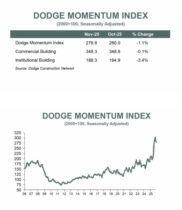 BOSTON, MA – December 5, 2025 — The Dodge Momentum Index (DMI), issued by Dodge Construction Network, decreased 1.1% in November to 276.8 (2000=100) from the downwardly revised October reading of 280.0. Over the month, commercial planning ticked down 0.1% and institutional planning declined by 3.4%. Year-to-date, the DMI is up 36% from the average reading over the same period in 2024.