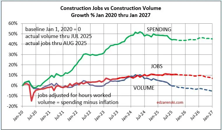 Environment for construction jobs looking difficult. Constant $ spending in 2026 is down just less than 1%. But Volume of work (spending minus inflation) available is down just over 4% and is declining all through 2026. Biggest declines by far, Manufacturing and SF Rsdn.