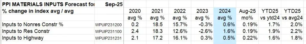 INPUTS thru Sept up ~2% from avg2024. Final Demand for Nonres Bldgs is up 1.2% ytd vs avg 2024. However, Oct is the revision month for Q3 Final Demand data, so Final Demand data not finalized for Q3.