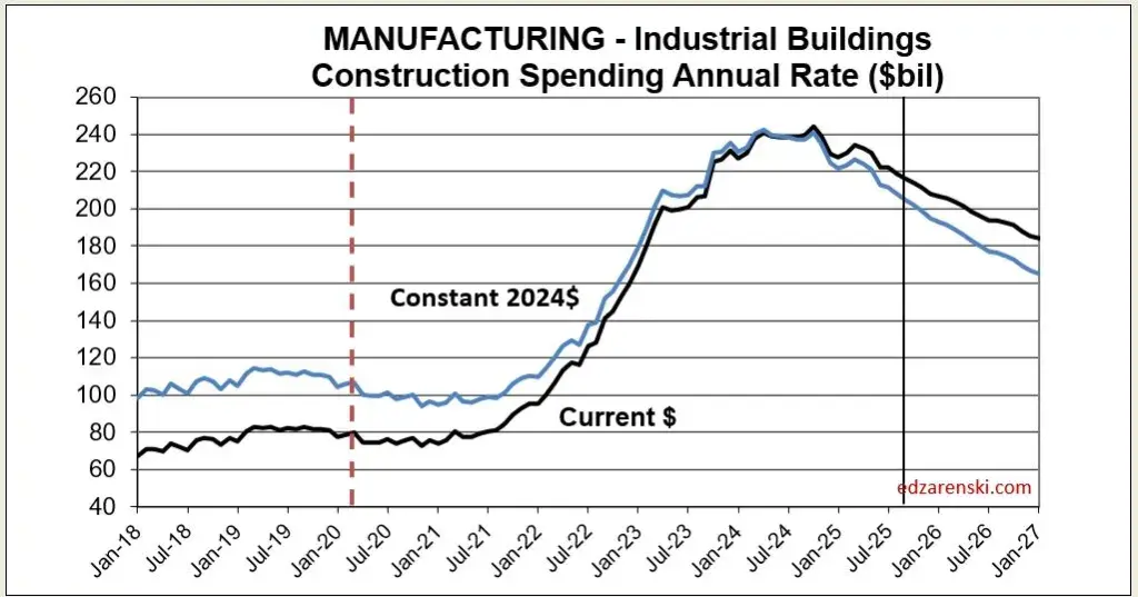 The decline in Manufacturing construction spending is due to having passed the peak in the scheduled project timelines for the large volume of mega-projects that started in 2021-22-23-24. (I wrote about it in more detail in Nov’24 in the article linked.) Peak spending is typically just past the midpoint of project construction. From Apr 2024 to Nov 2024, Mnfg spending averaged $240bil., the highest rate of spending on record. In 2025 it started the year at a rate of $$230bil but will end the year at $210bil. By the end of 2026 the rate of spending drops to $190bil.
